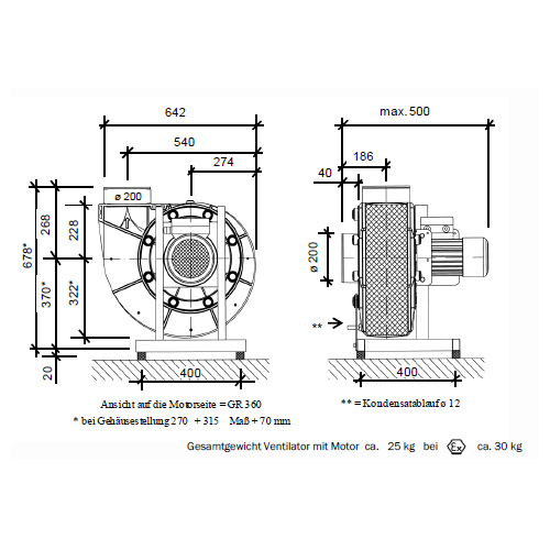 Direktgetriebener Radialventilator zur Förderung aggressiver Gase, Temperatur max 40°C Gehäuse aus PPs, in gespritzter Ausführung mit integrierten Dichtungssystem, bestehend aus Kondensatwehr als umlaufende Tropfkante und einer Labyrinthdichtung, Kondensatablaufstutzen an der tiefsten Gehäusestellung Laufrad mit rückwärtsgekrümmten Schaufeln aus PPs, in gespritzter Ausführung mit Rückenbeschaufelung für garantierten Unterdruck an der Wellendurchführung im Betrieb, Gehäusestellung GR, Ausblasrichtung 45° / 90° / 135° / 180° / 270° / 315° /360° Grundrahmen: Stahl-verzinkt Antrieb : Normmotor 3 x 230/400V, 50 Hz, IP55, Wärmeklasse F, mit Thermokontakt Zubehör : Gummi -Schwingungsdämpfer Volumenstrom m3/h 150 - 1680 Druckdifferenz PA 400 - 160 Schutzart PTC (Kaltleiter) Polzahl 4 Sync. Drehzahl bei 50 Hz 1500 1/min Motorleistung kW 0,25 Nennstrom bei 400 V 0,86 A Baugröße 71 Bauart B5 / IP55 |