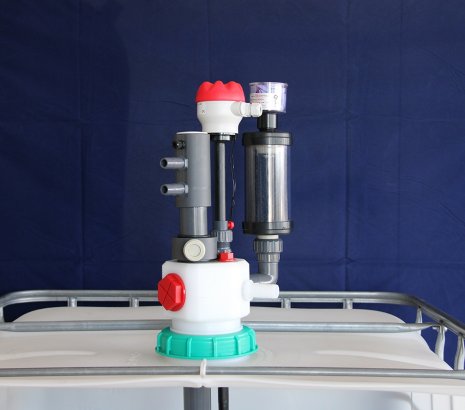 IBC-MULTI FLEX BLOCK, Anschluss Pumpensaugleitung Schlauchtülle d20mm ohne Niveaukontakte MIN / MIN-MIN 1x Säuredunstabscheider SDA90-1L mit ausgelegt für HCL-Abluft, mit Anschlußadapter auf IBC-MULTI FLEX BLOCK 1x Füllung PURO1 für SDA für HCl 1x pH- Indikatordose mit Farbindikator- anzeige Bindemittelwechsel für Säure mit Anschlußadapter für SDA90-1L
