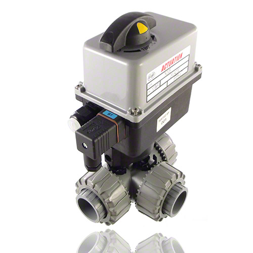 | 3/2-Wege-Kugelhahn aus ABS mit elektrischem Stellantrieb mit Endlagenrückmeldern, Handnotbetätigung und optischer Stellungsanzeige Kugel mit L-Bohrung Standardkugelstellung: 1 Stellantriebsdaten: Standard 90-240V / 50-60Hz (AC) ohne Aufpreis 24V AC/DC Andere Spannungen auf Anfrage ***DN50 = PN16 auf Anfrage Anschluss: Klebemuffe Dichtung: PTFE/EPDM |