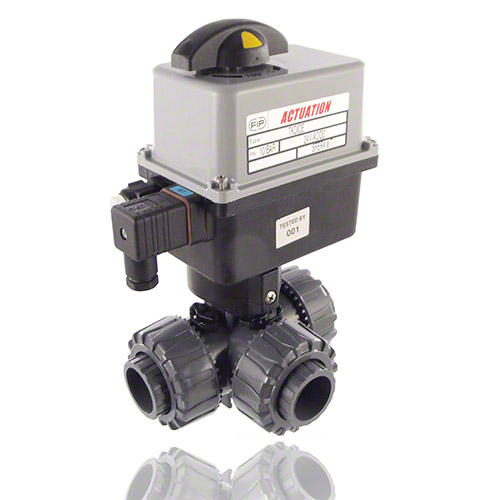 | 3-Wege-Kugelhahn aus PVC-U mit elektrischem Stellantrieb mit Endlagenrückmeldern, Handnotbetätigung und optischer Stellungsanzeige Kugel mit T-Bohrung Standardkugelstellung: 1 Stellantriebsdaten: Standard 90-240V / 50-60Hz (AC) ohne Aufpreis 24V AC/DC Andere Spannungen auf Anfrage ***DN50 = PN16 auf Anfrage Anschluss: Klebemuffe Dichtung: PTFE/EPDM |