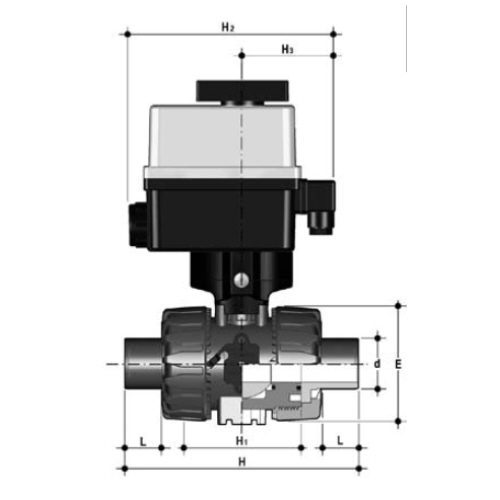 | 2/2-Wege-Kugelhahn mit gesicherten Überwurfmuttern aus PVC-U mit elektrischem Stellantrieb -mit Endlagenrückmeldern, Handnotbetätigung und optischer Stellungsanzeige -Stellantriebsdaten: Standard 90-240V / 50-60Hz (AC), ohne Aufpreis 24V AC/DC -Andere Spannungen auf Anfrage -***DN50 = PN16 auf Anfrage -Anschluss: Klebestutzen -Dichtung: PTFE/EPDM |