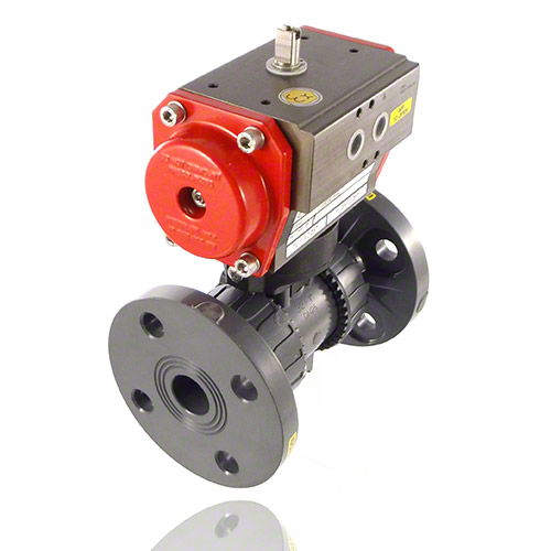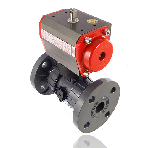 2/2-Wege-Kugelhahn mit gesicherten Überwurfmuttern aus PVC-U mit pneumatischem Stellantrieb