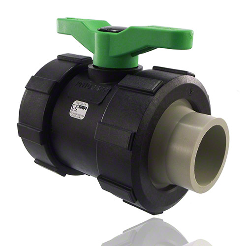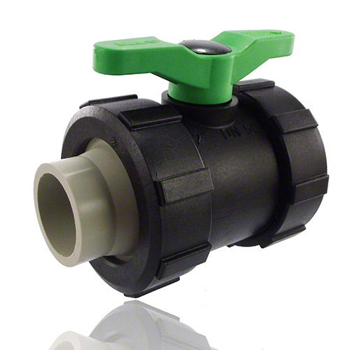 2-Wege-Kugelhahn PPGF, PE-Stutzen, FPM = grüner Hebel