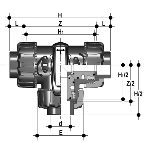| -Bohrung: T-Bohrung -Anschluss: Klebestutzen -radial ein- und ausbaubar -mit gesicherter Überwurfmutter -Dichtung: PTFE/FPM -mit allseitigen Festflanschen aus PVC-U auf Anfrage |
