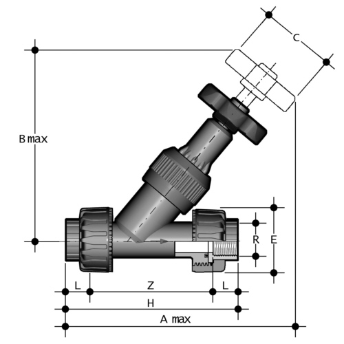 PVC-U Schrägsitzabsperrventil, Gewindemuffe, EPDM