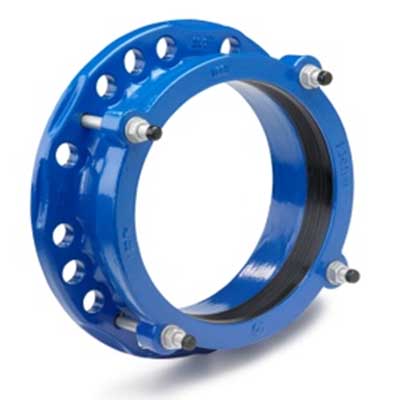 Flanschadapter mit großem Spannbereich und  einem Grundkörper aus  qualitativ hochwertigem  Duktilguss  GGG 450-10. Die Epoxidharzbeschichtung  verstärkt den Langzeit-Korrosionsschutz, ist verschleißbeständig und schützt vor Korrosionsfolgeschäden.  Andere Beschichtungen sind auf Anfrage lieferbar.  Schrauben und Muttern werden aus hochwertigem  Edelstahl  (A2-70) gefertigt.